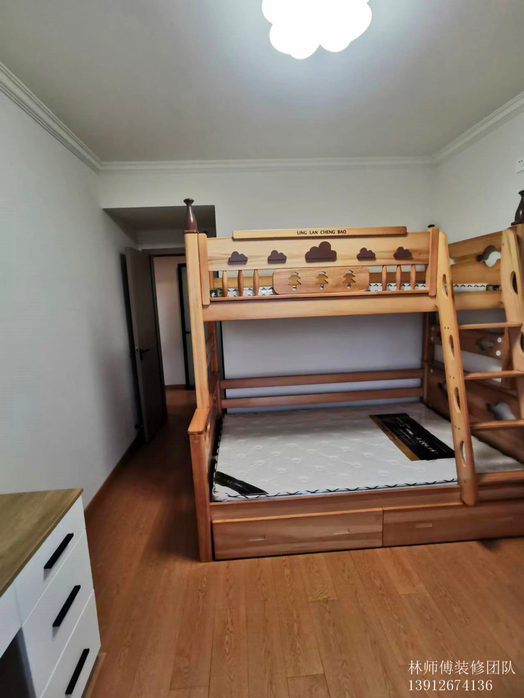 次卧也是儿童房,上下床能满足家里的二孩需求,靠窗的两侧,一侧是衣柜,满足孩子衣物的收纳,另一边是书桌+橱柜的组合,方便孩子写作。除此之外,整个房间也留足了活动空间,孩子可以尽情的玩耍!