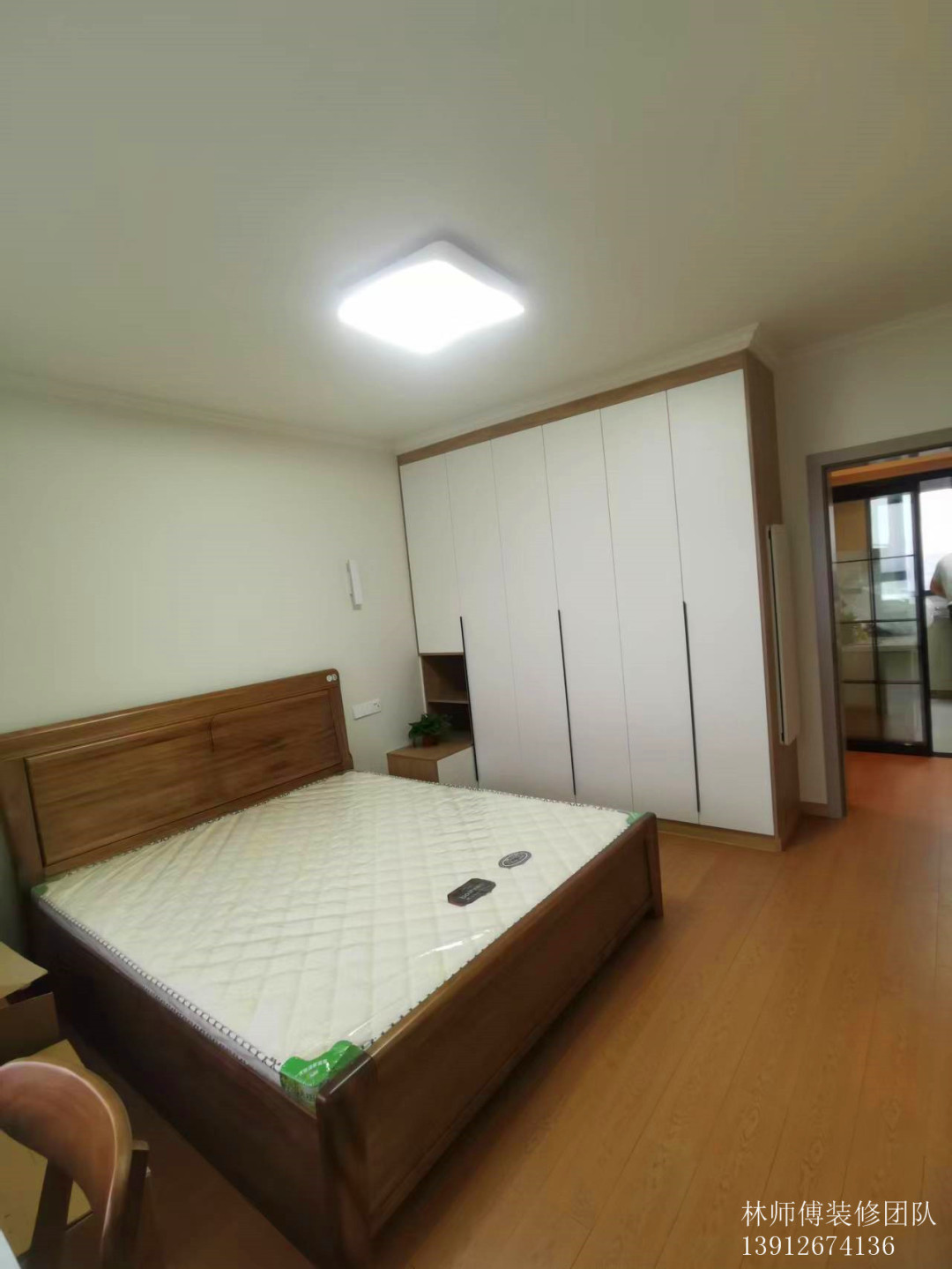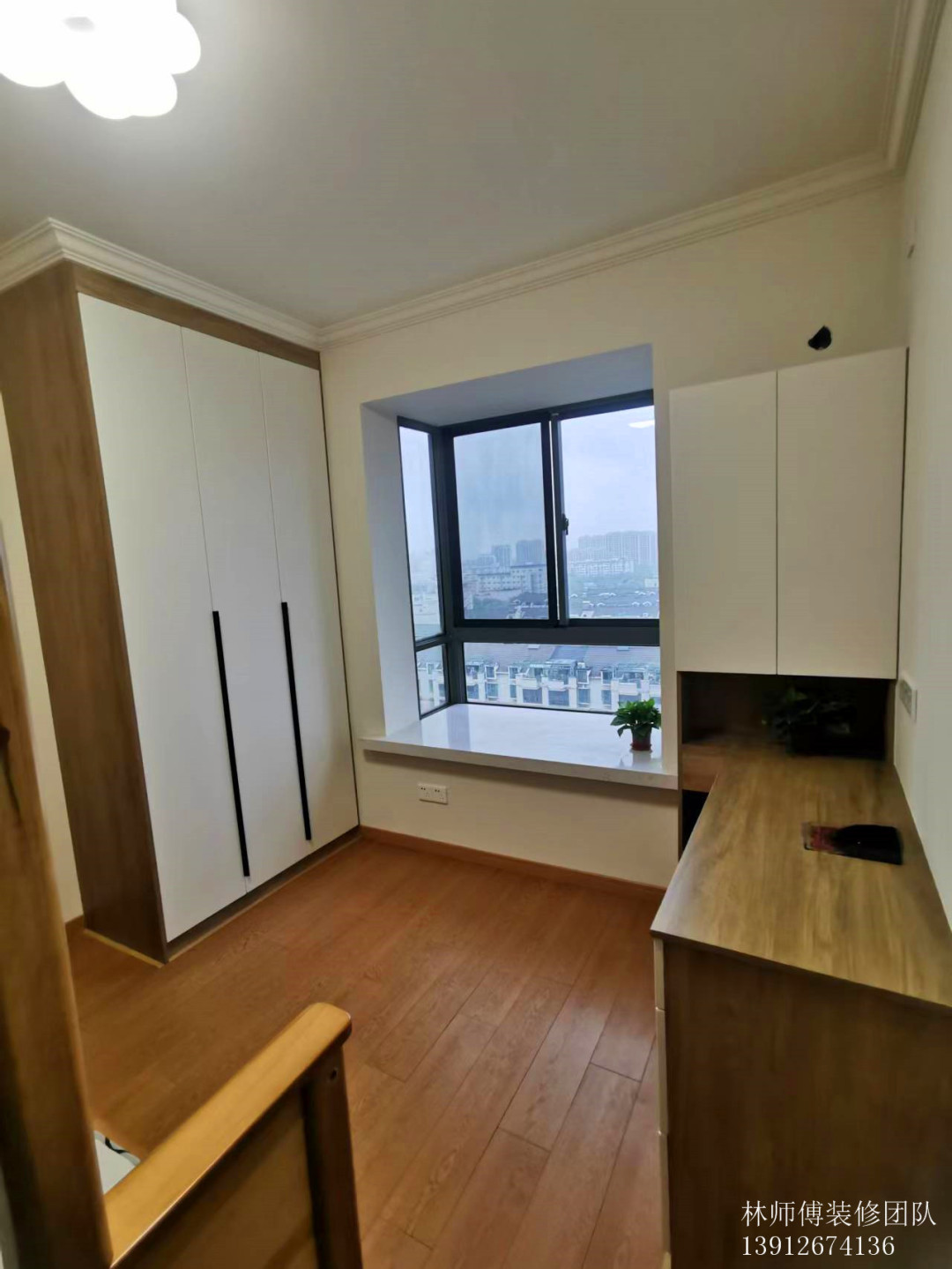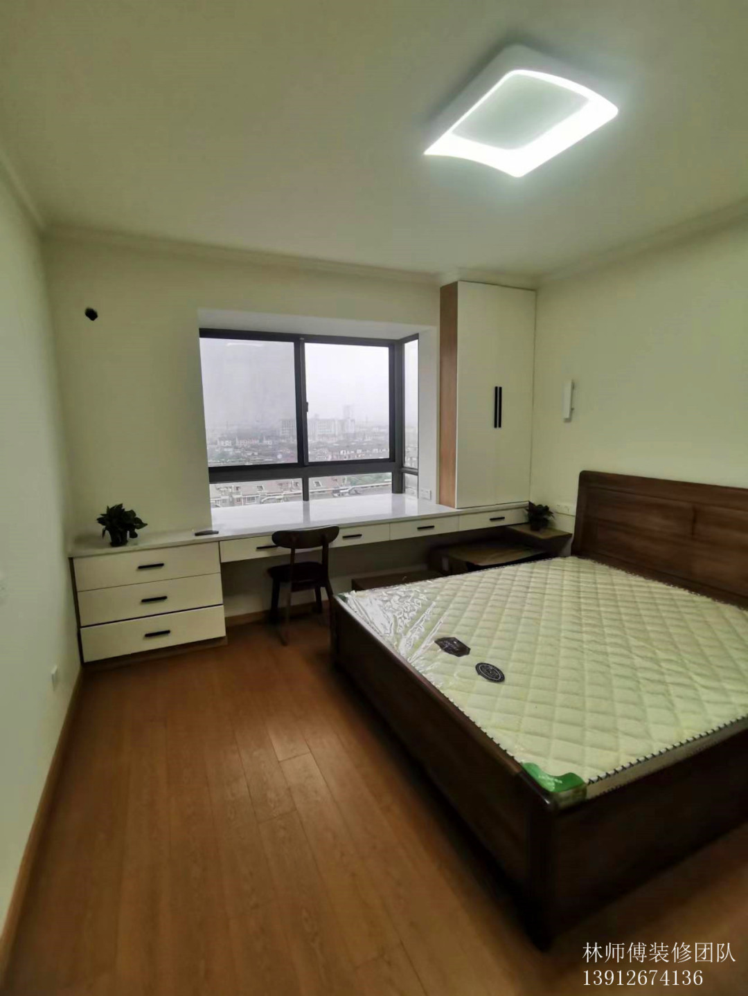 主卧也是延续了整个房子的简约风格,木质双人床,多了一份宁静,给人一个安静舒适的休息环境。飘窗延伸出来做了一个书桌,不管是用做梳妆台还是办公桌,都可以。房间的另一边是衣柜,到顶的大衣柜,也能妥妥的能装。