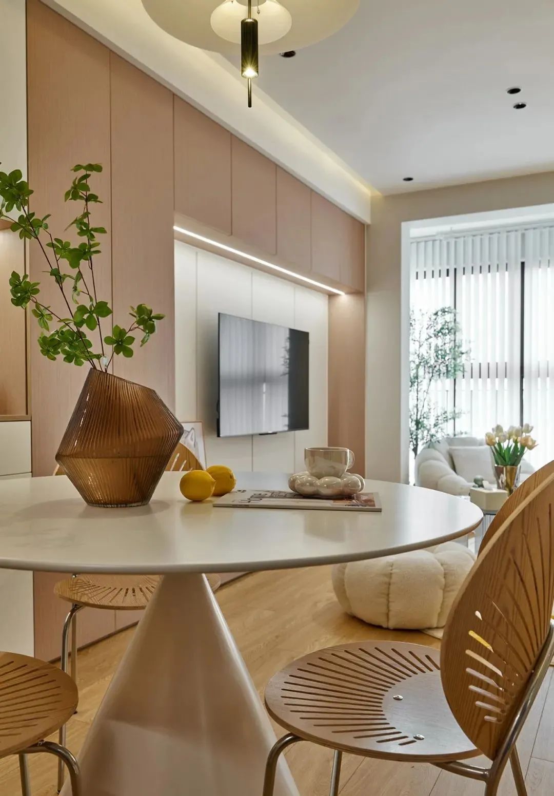 ▲ 入户即是餐厅,餐区以纯白餐桌为核心,让木元素的不同色度、质感、纹理在绿植的引导下,演绎四季变换的微妙生态与自然静逸的美好诗意