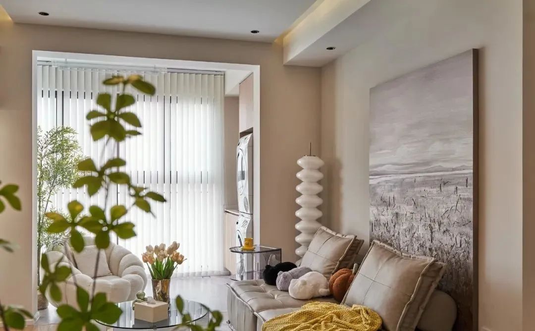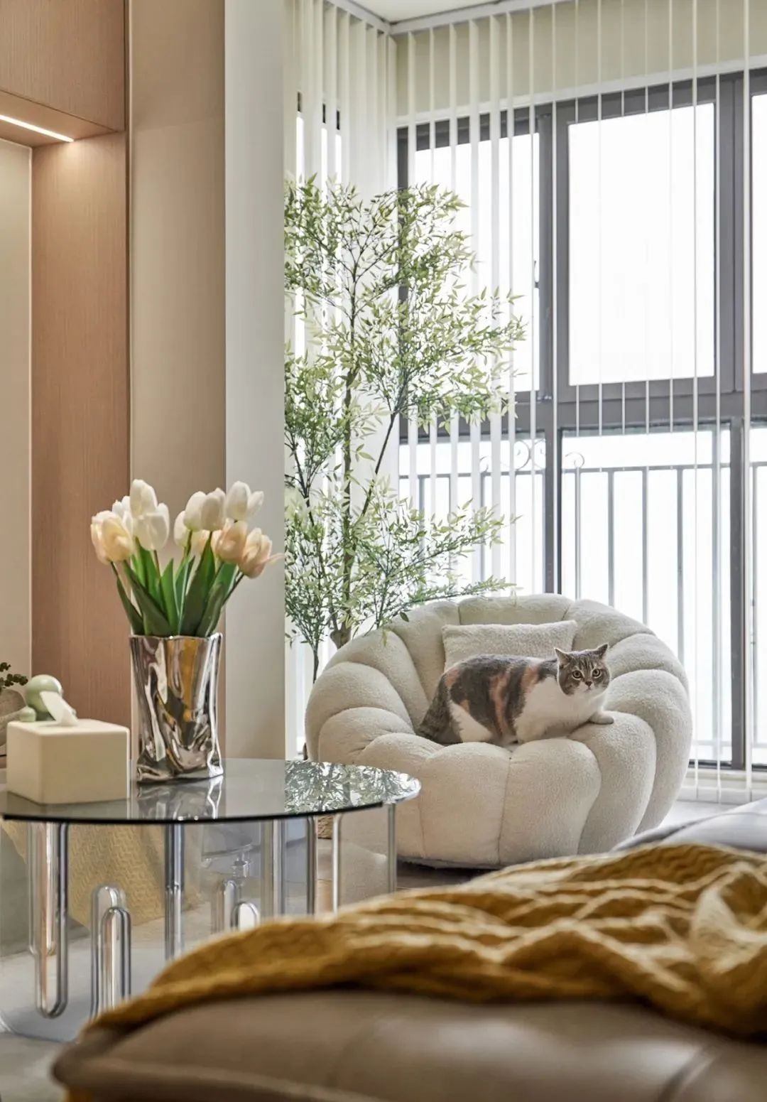 ▲ 客厅纳入阳台后,空间得到拓展,保留L型大落地窗设计,让电视背景墙的实感与清透玻璃的虚感碰撞,激活空间生命力,安装质感温润的垂直帘,柔美与明亮并存