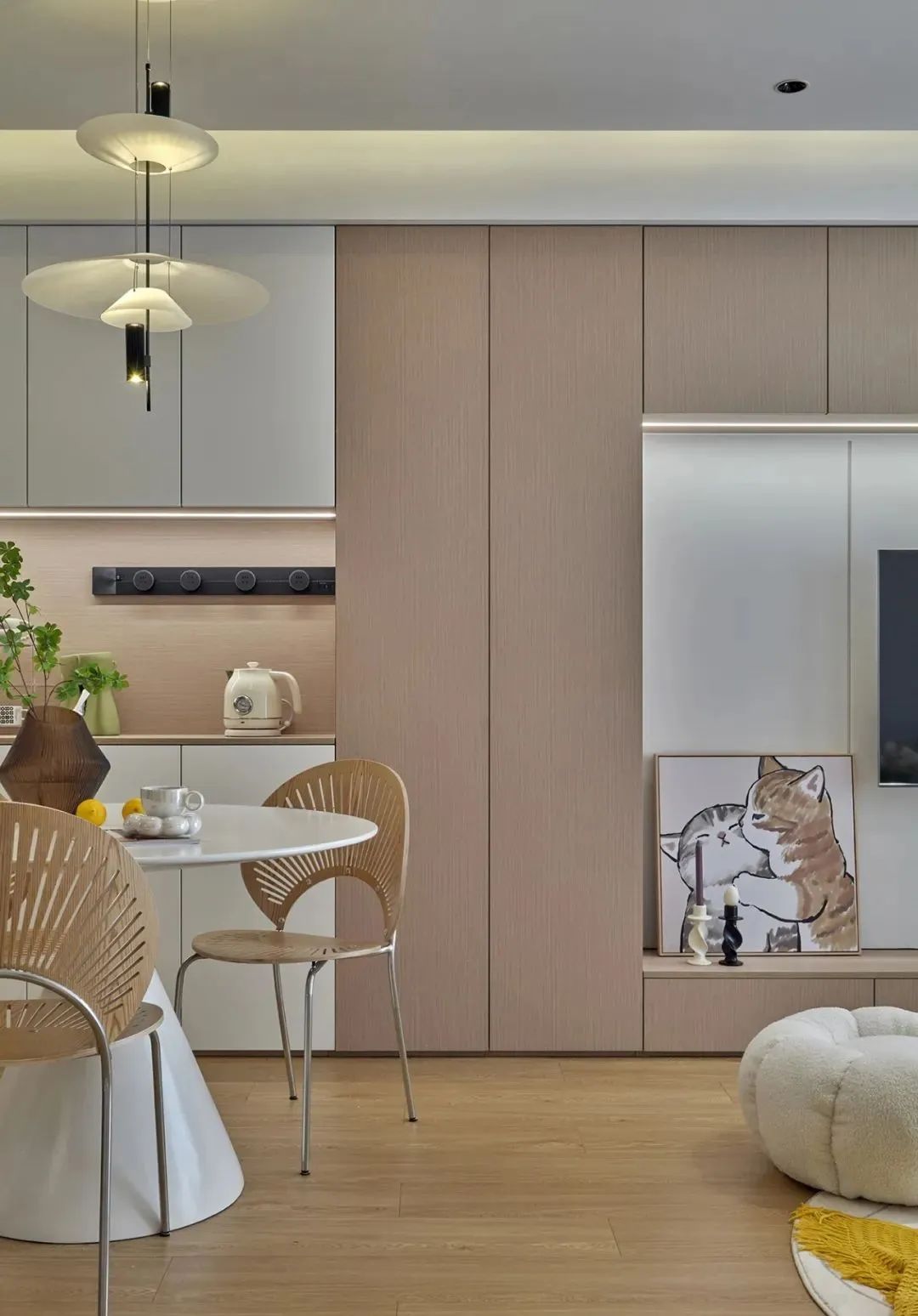 ▲ 串联多重功能区,是居家生活的情趣,相同材质的定制柜以不同的颜色对一体化空间的功能区进行划分,餐厅吊灯与客厅串珠落地灯相呼应,家就是在不断地变化中形成整体的统一