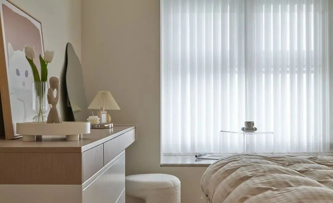▲ 床尾利用桌柜组合构建功能区,是女屋主的专属梳妆台,得以保留的小飘窗同样安装垂直帘,配合自然光影成为独立安静的一隅