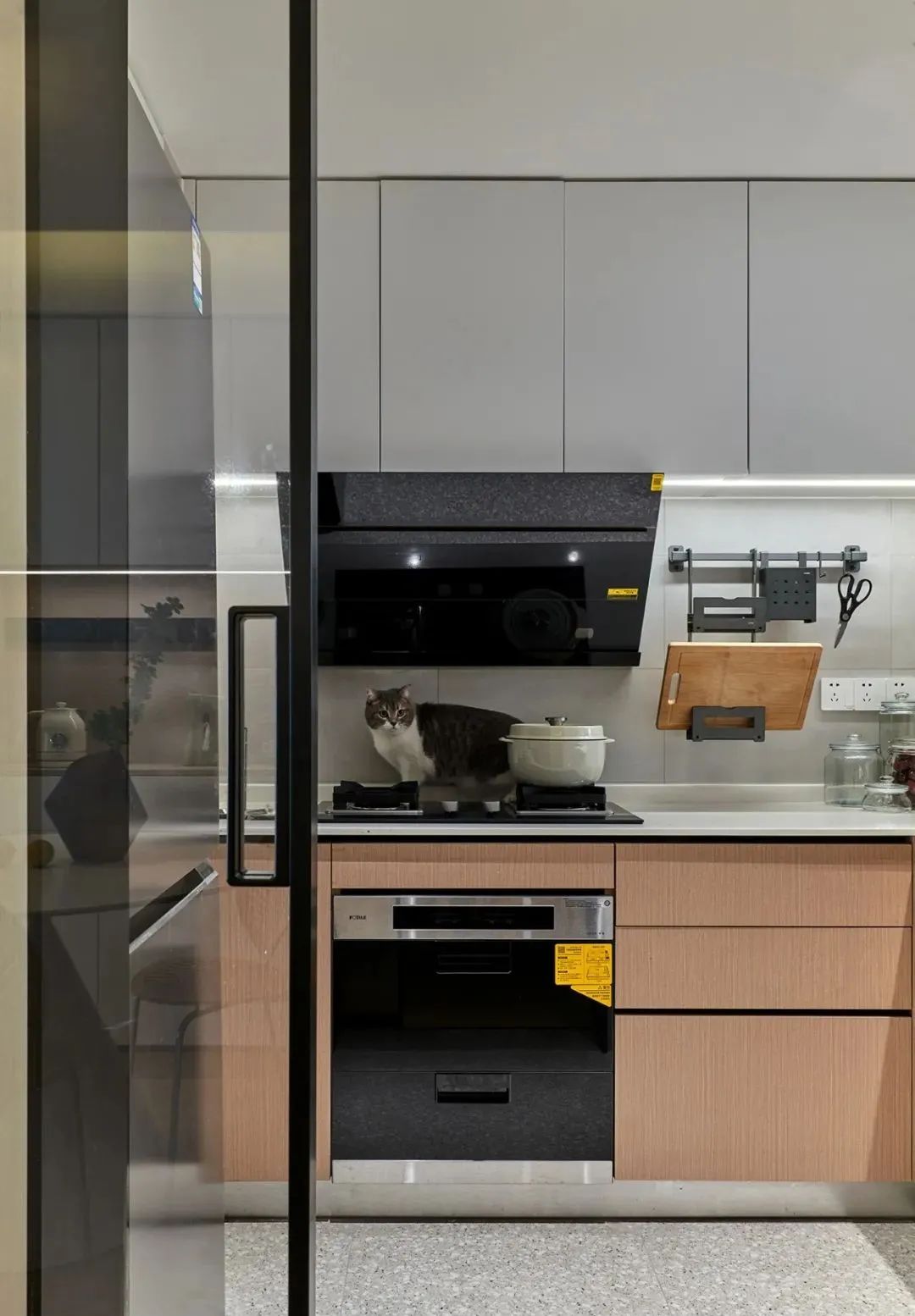 ▲ 厨房,清玻移门隔离油烟,灰色水磨石瓷砖铺地,橱柜选用拼色模式,冷暖色调结合,拼合出利落的形态,有效形成下沉上轻的美感,同时兼顾储藏性、分区性、系统性,为日常烹饪提供简明便利的操作环境