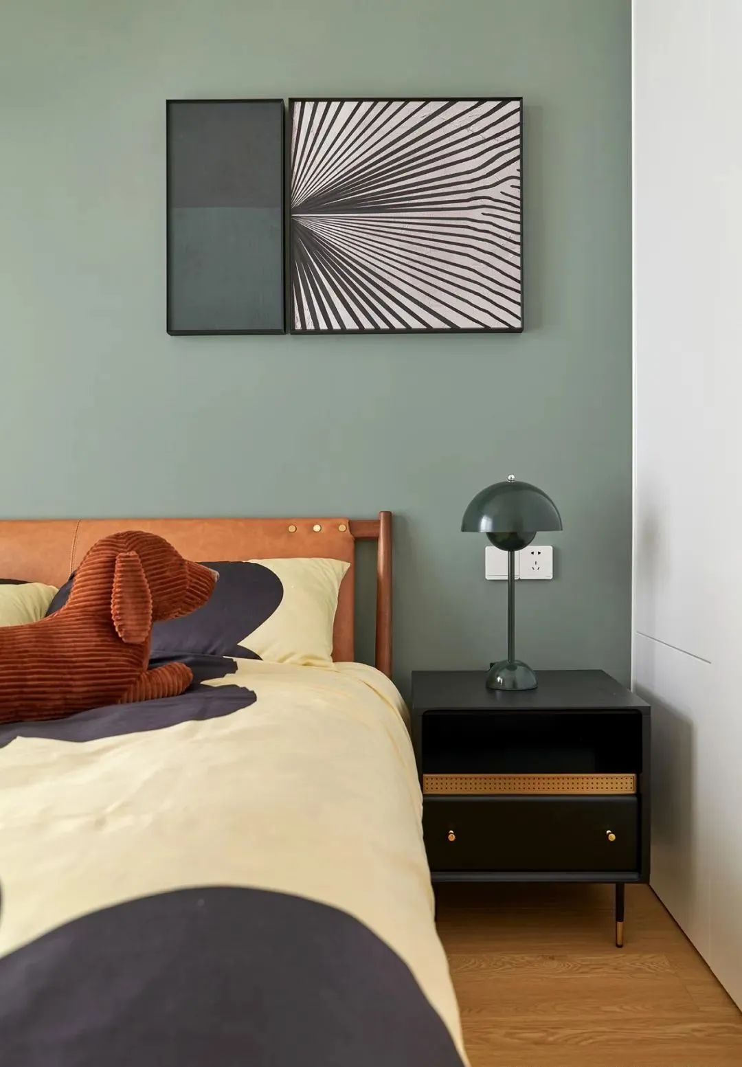 ▲ 次卧,灰绿色系在床头背景嬉戏,棕色床头靠背的块面激荡出艺术张力,以放射状的精妙装饰画进行中和,营造出个性别致的轻复古基调
