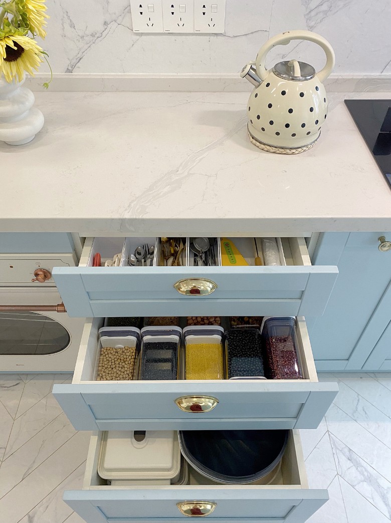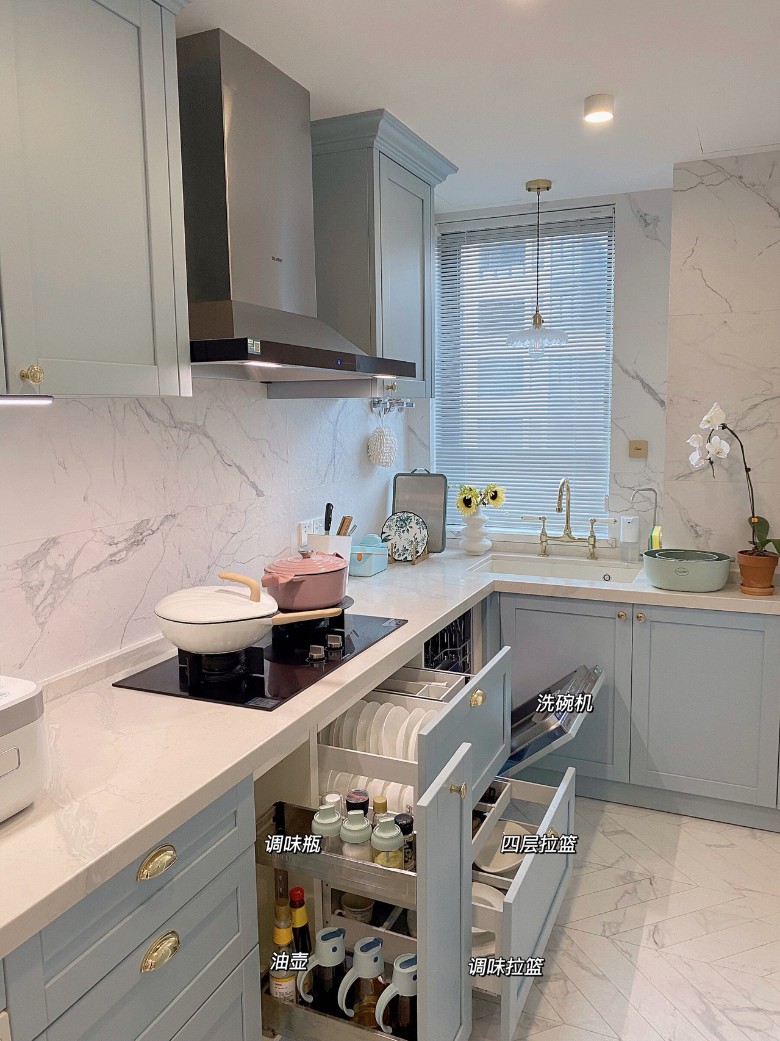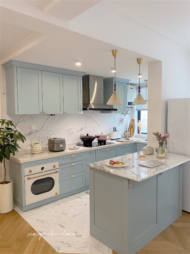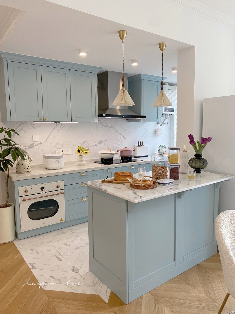 蓝白色搭配清新自愈的开放式厨房,细节满满 不错的岛台。