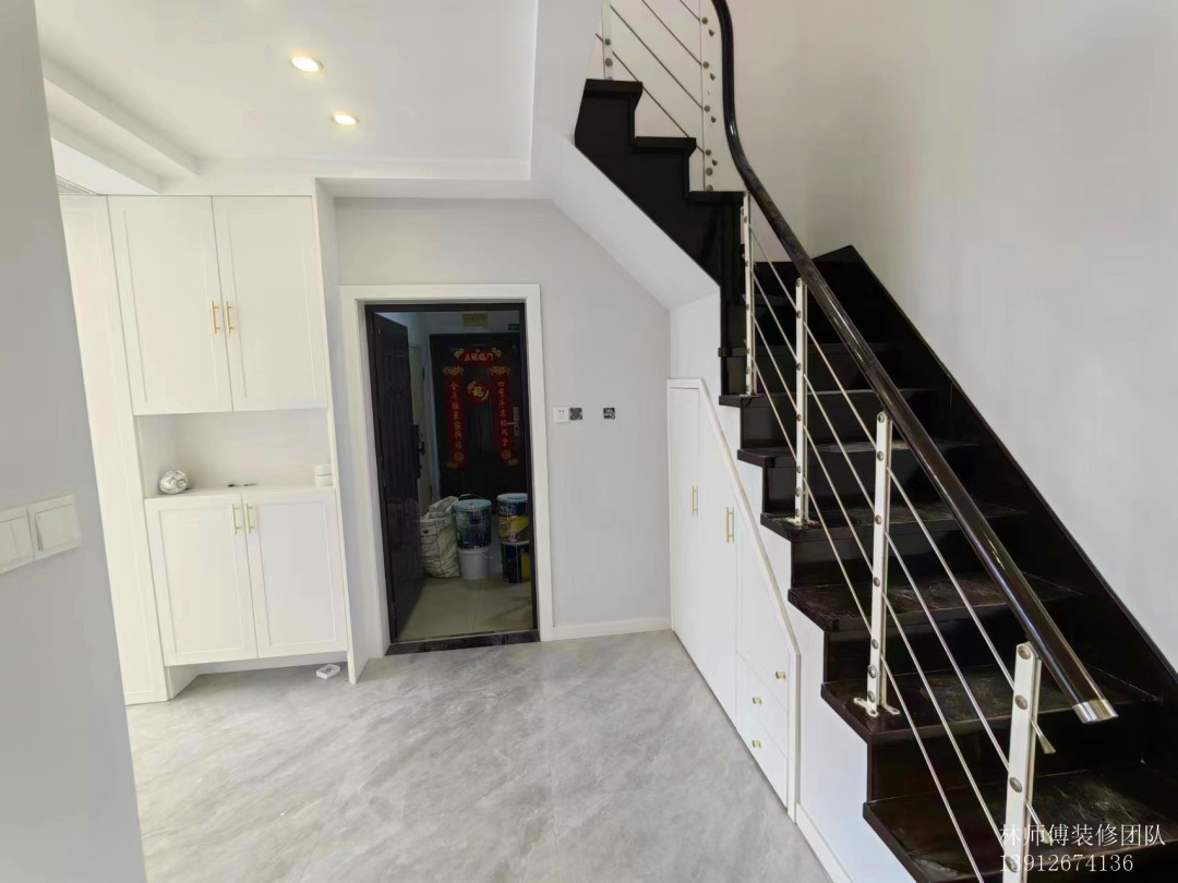 进门没有玄关,因此门口的右边墙设计了一面到顶的鞋柜,用来收纳一家人的鞋子,底下留空用来整理经常换穿的鞋子,中间留空放包包或者饰品。门口的左边是楼梯,黑色的设计和家里整体的白色冲击,增加视觉张力和层次感。黑白鲜明,经典时尚!