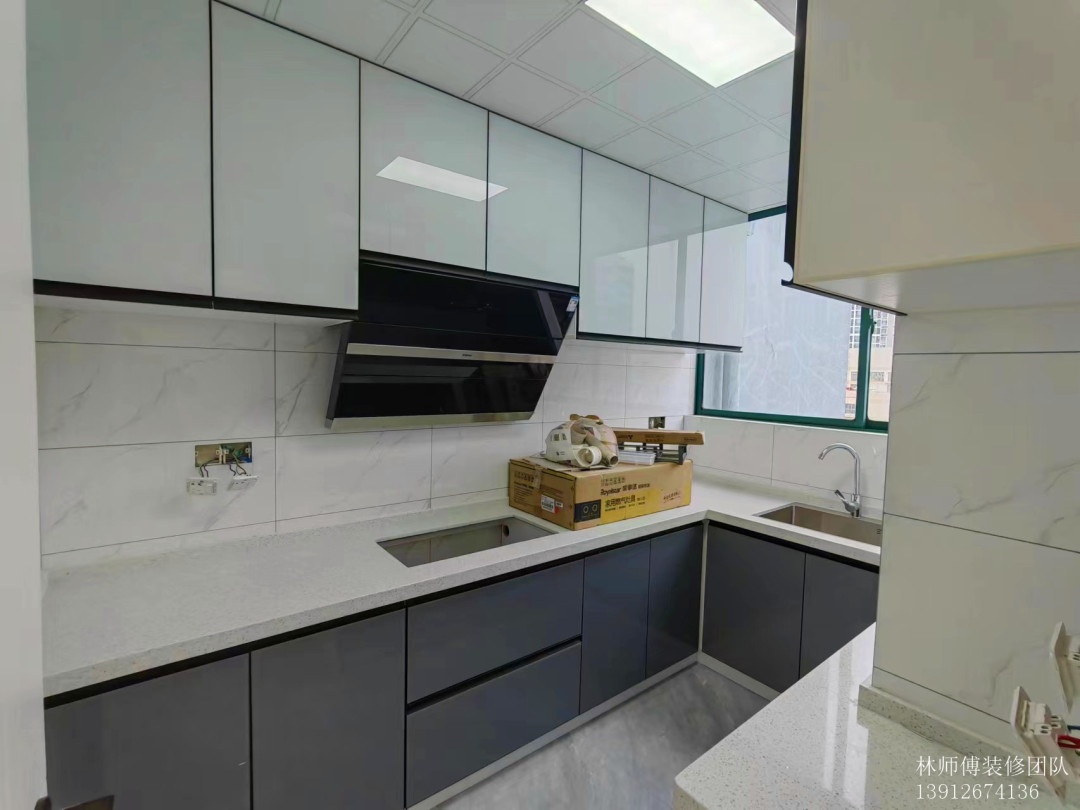 厨房设计动线合理,方便操作。吊柜是白色面加黑色边框,经典时尚,下面的柜子是灰色柜,耐脏易打理。