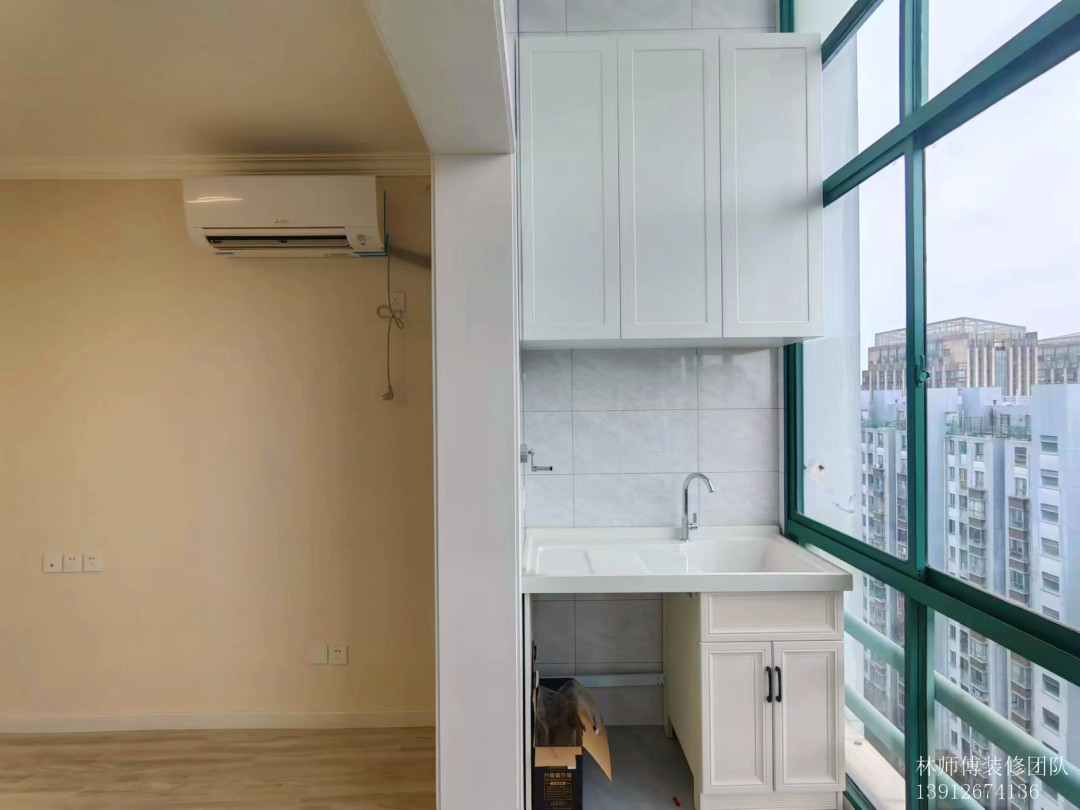 阳台有大大的落地窗,阳光充足,阳台与客厅没有做移门隔断,这也会让客厅显得更开阔敞亮。一边是湿区,另一边是干区收纳。