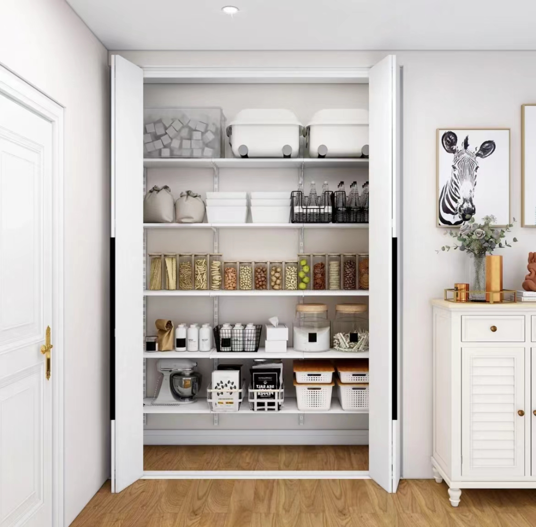 墙体承重足够可以安装金属架,调整也更加灵活。如果不能满足承重,也可以选择成品货架,宽度最好选择30cm-50cm的。但要提前测量好尺寸,小储藏间能否放得下。