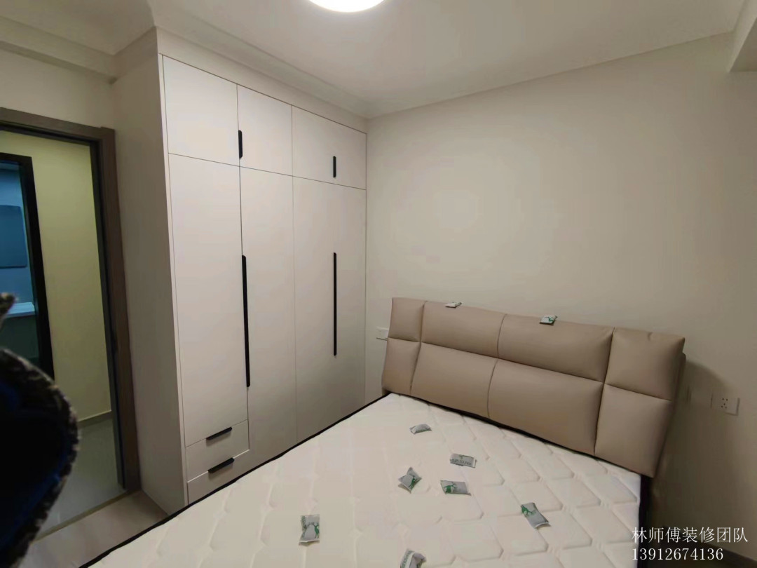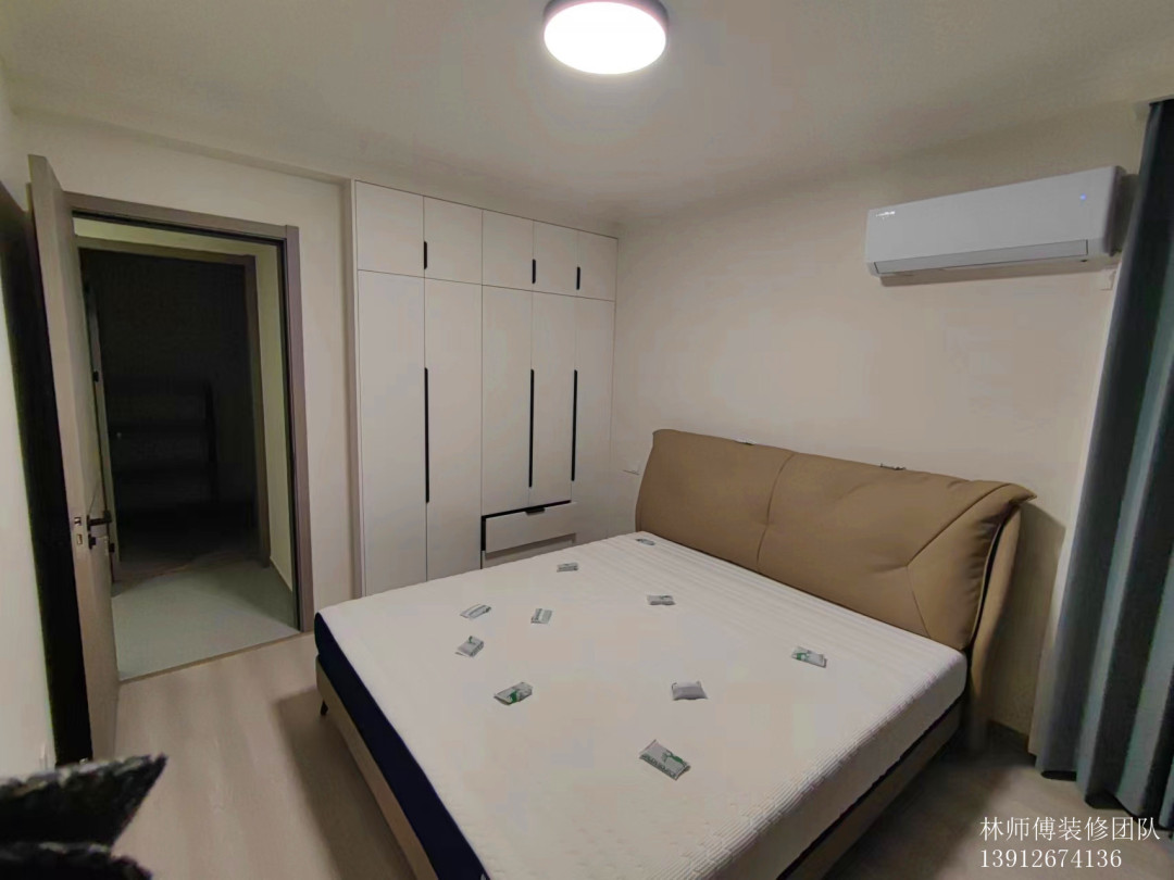 次卧,一张暖灰色软包大床,一面到顶的衣柜,简约而舒适。