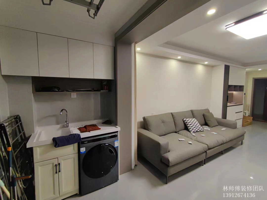 阳台和客厅都是连通的,通铺地砖,整体又统一。阳台的两头都有橱柜,辅助收纳。洗衣机安排在吊柜下面,不仅节约空间,使用起来也非常方便。