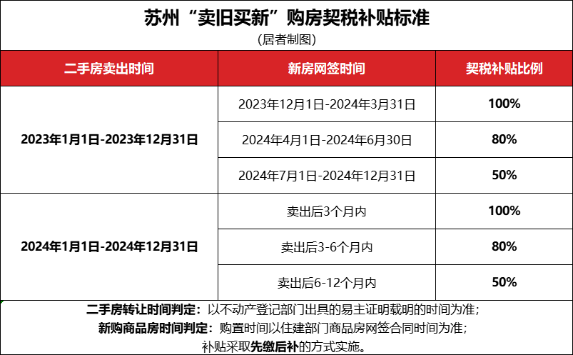 自2023年12月1日起苏州市实施“卖旧买新”购房契税补贴,凡是2023年1月1日来在苏州大市范围内出售自有住房,并在2023年12月1日-2024年12月31日期间购买新房的,都可以分层次享受购房契税补贴,买得越早越实惠,最高可享受100%购房契税补贴。