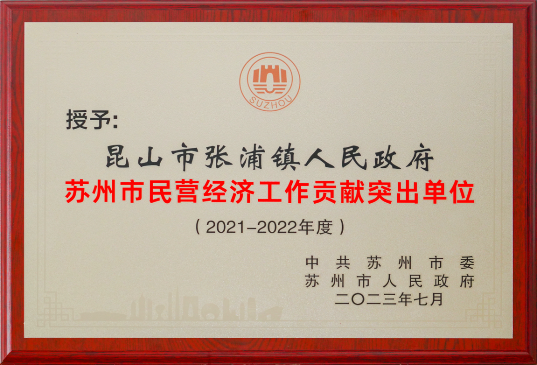 去年7月21日,昆山市张浦镇人民政府被授予2021—2022年度苏州市民营经济工作贡献突出单位。