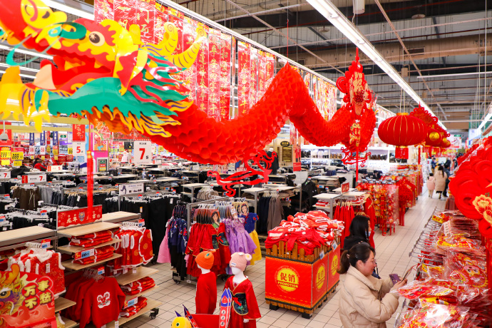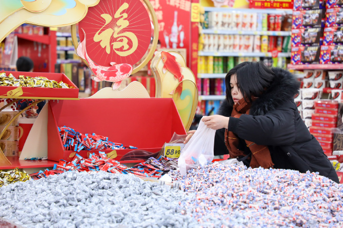 春节临近,昆山各大商场超市纷纷开设了年货集市,商品琳琅满目,年货品种齐备,货源充足,物价平稳,人们忙着选购红火的年货,喜迎新春佳节。