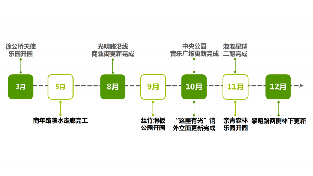 2023年,花桥陆续完成了徐公桥天使乐园、商年路滨水走廊、光明路沿线商业街更新、丝竹滑板公园、“这里有光”馆外立面更新、中央公园音乐广场更新、亲青森林乐园、泡泡星球童趣口袋公园二期和黎明路两侧林下更新等一批公园、“昆小薇”项目建设,截至目前,花桥的公园数量已增加至32个。
