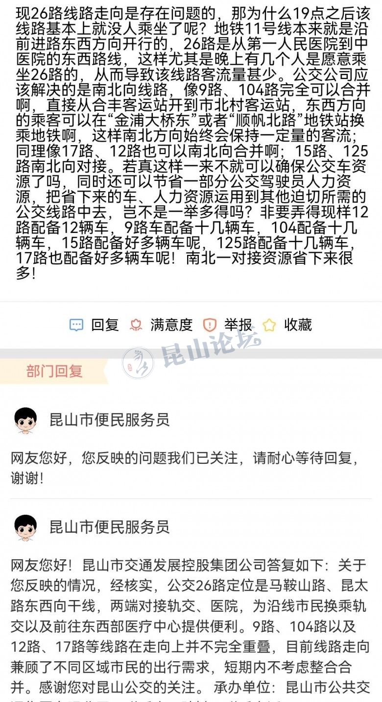 现在公交换乘公交、或者公交换乘地铁都是有减免优惠措施的(换乘每次最多减免2元票);在该政策优惠下,昆山公交更应该把长线路的公交优化一下线路,尽量缩短公交线路,让市民能方便快捷地换乘其他公交或者地铁才是上上策。比如说12路从朱家湾村委会到火车站北广场要将近70分钟的时间,再说一般人都不太喜欢绕来绕去,何况现在11号线地铁也开通了;那现在12路的首要任务就是接驳市民去就近地铁站换乘,然后乘地铁到“玉山广场站”下再换乘1路车到达火车站北广场,这样只需35分钟到40分钟左右,比光乘坐12路要方便的多呢,何乐而不为呢? 像12路、26路、138路、51路、55路、53路、124路、126路等等都要优化一下线路,尽量做到截弯取直和缩减线路,大型公交车就走大路,不要去走小路了(12路车配有12辆大车,居然还走环北路、白塘路、康庄路等这些小路,搞得有时候转弯都不太好转),是时候要整体优化一下全市公交线路了,现当今时代公交车不能再围绕汽车站、火车站转了,而是要考虑到公交地铁换乘所带来的便捷性!毕竟地铁可以准点到达目的地,几乎没有延误的列车;公交围着地铁站台转才是硬道理!