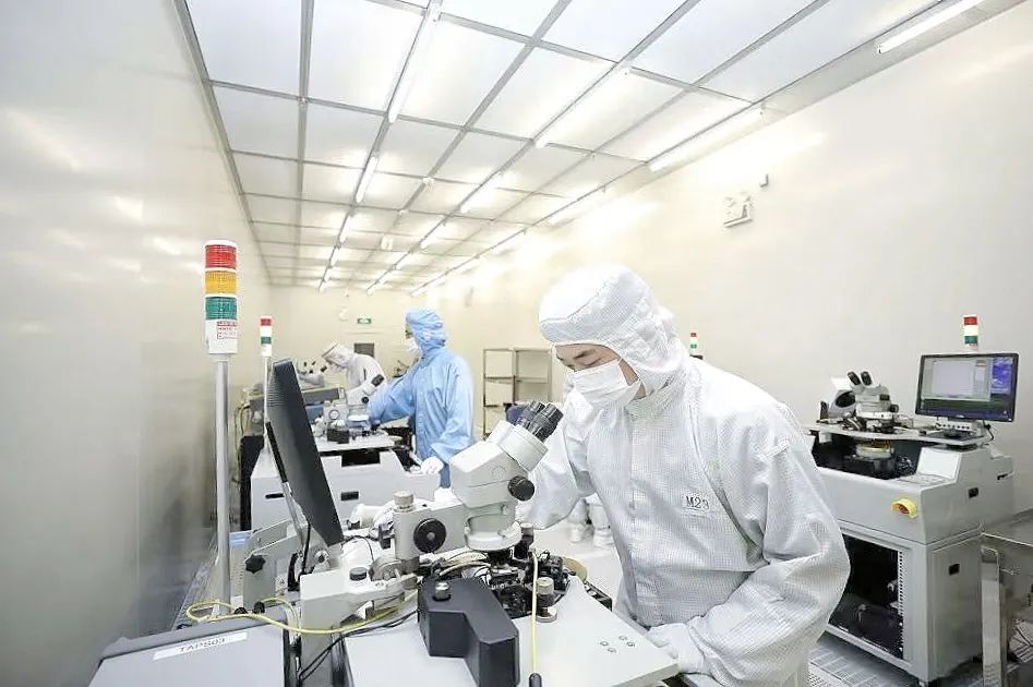走进苏州能讯高能半导体有限公司无尘车间,一条条生产线加速运转,员工们正在各自的工作岗位上紧张且有序地加工氮化镓电子器件。
