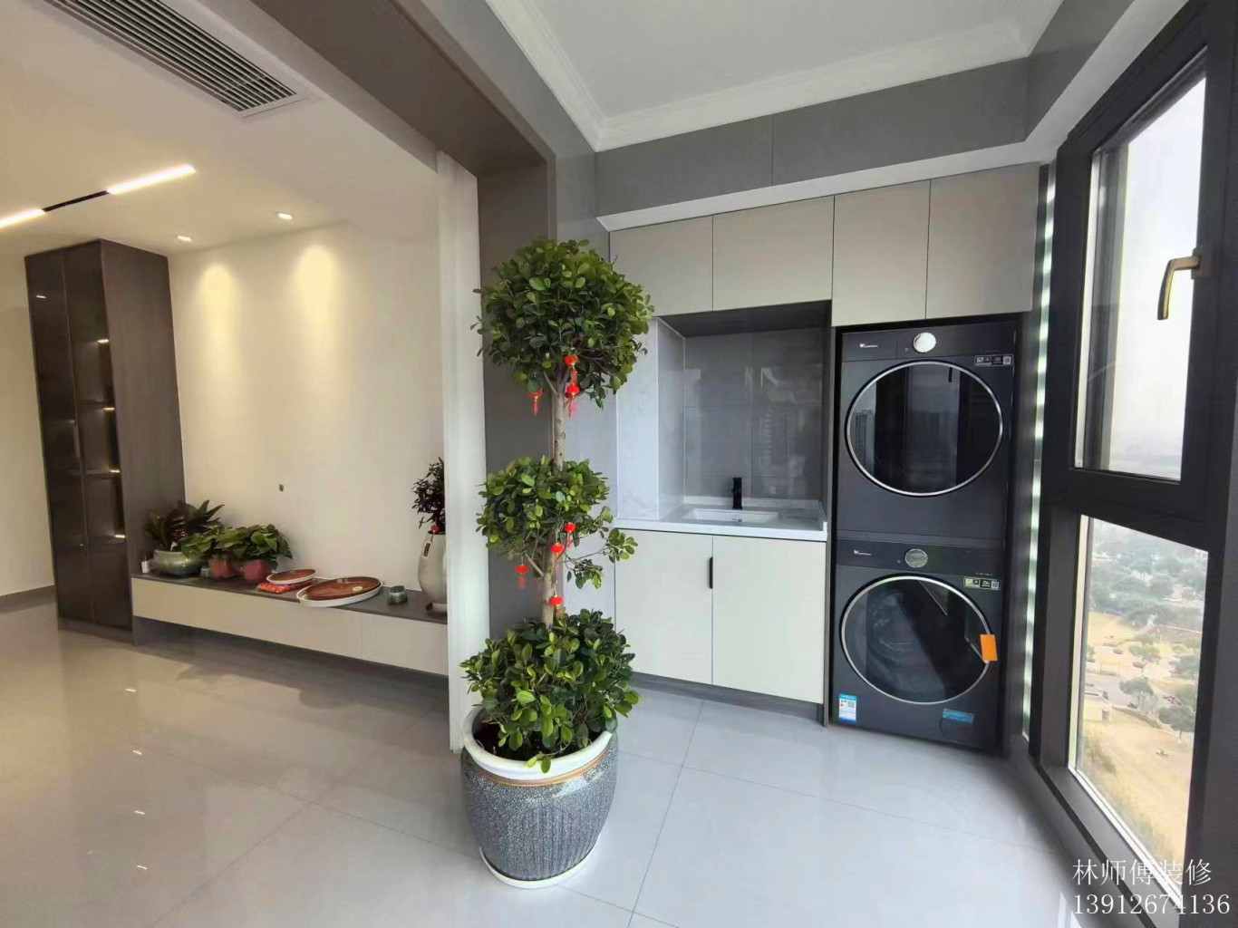 将阳台归入客厅空间,扩大空间的同时,更好的将自然光引入室内,让整个空间的采光更加充沛。不仅如此,阳台一侧还设计了内嵌式,将洗烘机收藏到橱柜里,更加协调统一。