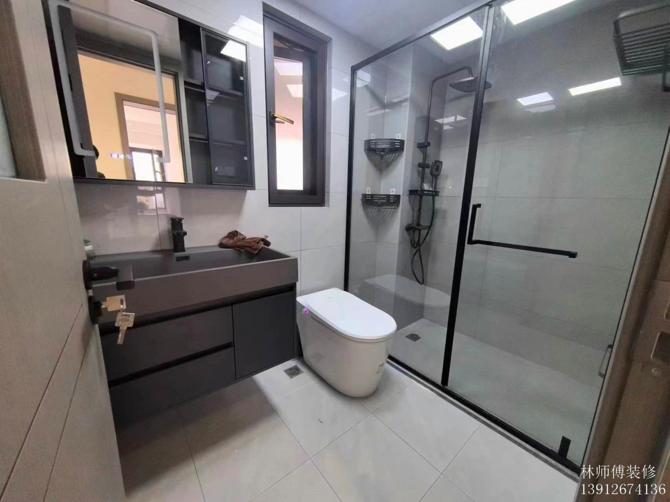 卫生间以灰色为主,深色点缀,层次分明,简约时尚。镜面柜+吊柜,不仅收纳充足,打扫卫生也非常方便。窄边玻璃移门也是极简风格的常驻哦~