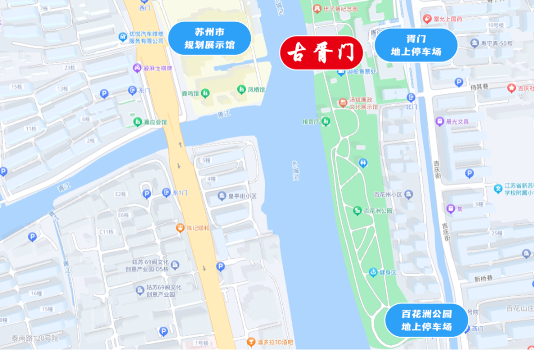 机动车可停放在胥门停车场、百花洲公园停车场、苏州市规划展示馆、西大街沿线停车位。