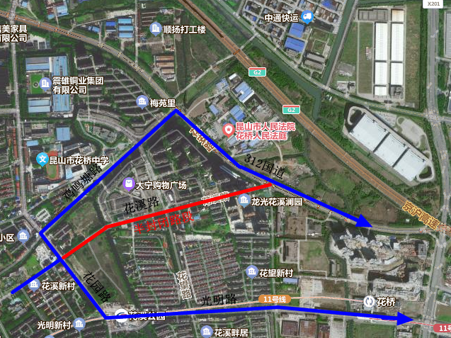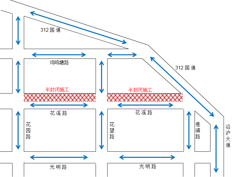 施工期间绕行线路:花溪路由西向东车辆可由花溪路—花园路—光明路绕行,或由花溪路—花园路—鸡鸣塘路—312国道绕行。