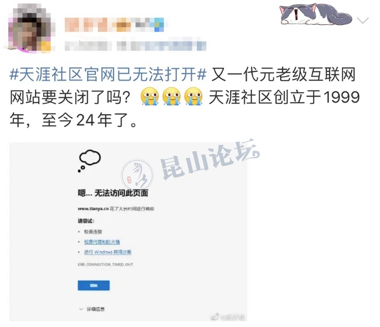 [color=rgba(0, 0, 0, 0.9)]在发现天涯社区无法正常打开后,网友在社交平台上掀起“悼念潮”:天涯关了,咫尺天涯,永不再见。