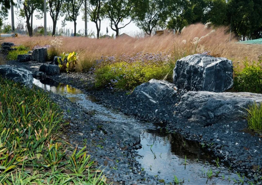 南新路西侧由于农田和湖面标高高于道路,少量水体通过堤坝或田埂渗入路边绿地,在道路两侧形成天然的下凹沟渠。项目通过清理沟渠、铺设碎石、种植耐水湿植物,使沟渠内雨水径流以较低流速经碎石沟储存、过滤和渗透,可有效去除雨水中35%-90%的污染物。
