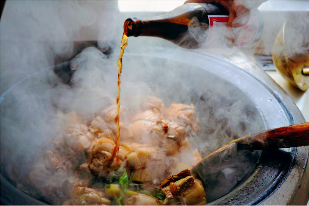 加入各种调味料,便开始正式烧制了肉块在土灶锅中上下翻腾