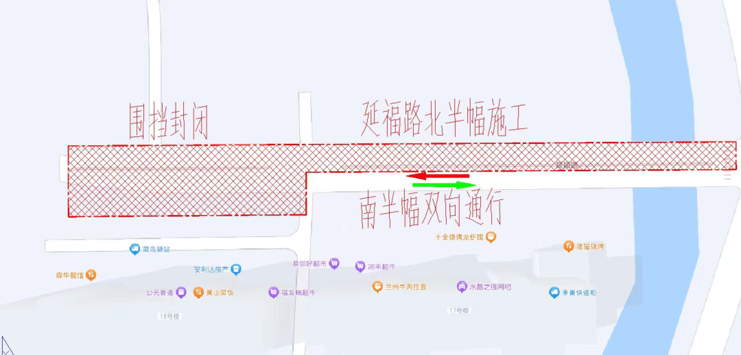 延福路南半幅设置双向车道,延福路两侧行人及车辆可通过延福路南半幅进出。