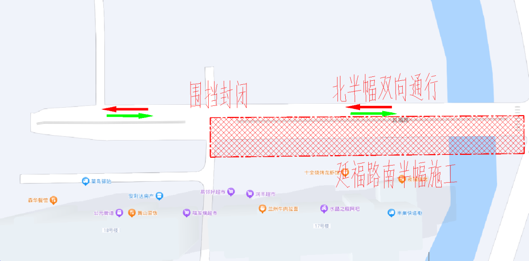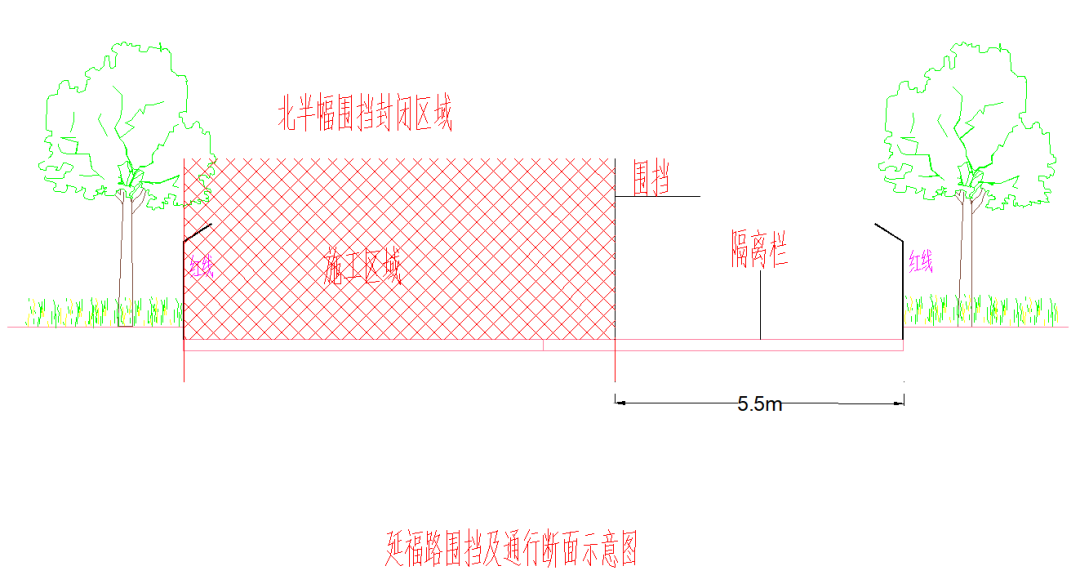 延福路北半幅设置双向车道,延福路两侧行人及车辆可通过延福路北半幅进出。