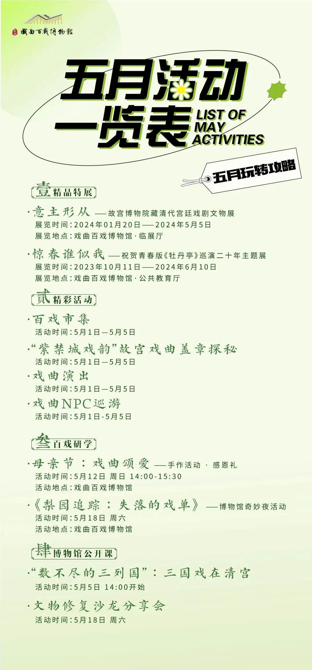“五一”国际劳动节将至,为丰富观众的参观体验,戏曲百戏博物馆奉上精彩活动,邀您一起欣赏繁花似锦的五月。