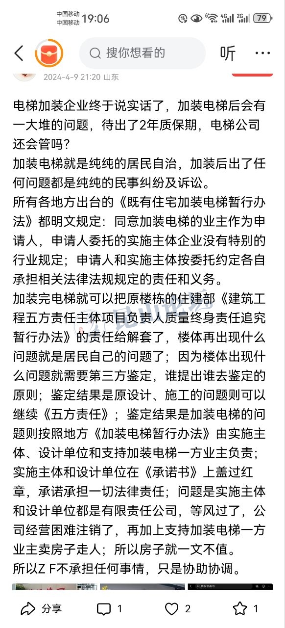 看官:你觉得不好,可以不同意装,⅔同意了,装了,你不要用就好了嘛。好处坏处,不是想当然,不是张口就来的哇。上海装那么多,房子都倒了吗?昆山装了也不少了,也没看到有人发帖子说装了以后出各种问题的啊。 个人认为,装电梯是好事,主要是后期需要政府兜底,不能甩手不管 .. (2024-04-29 17:30)