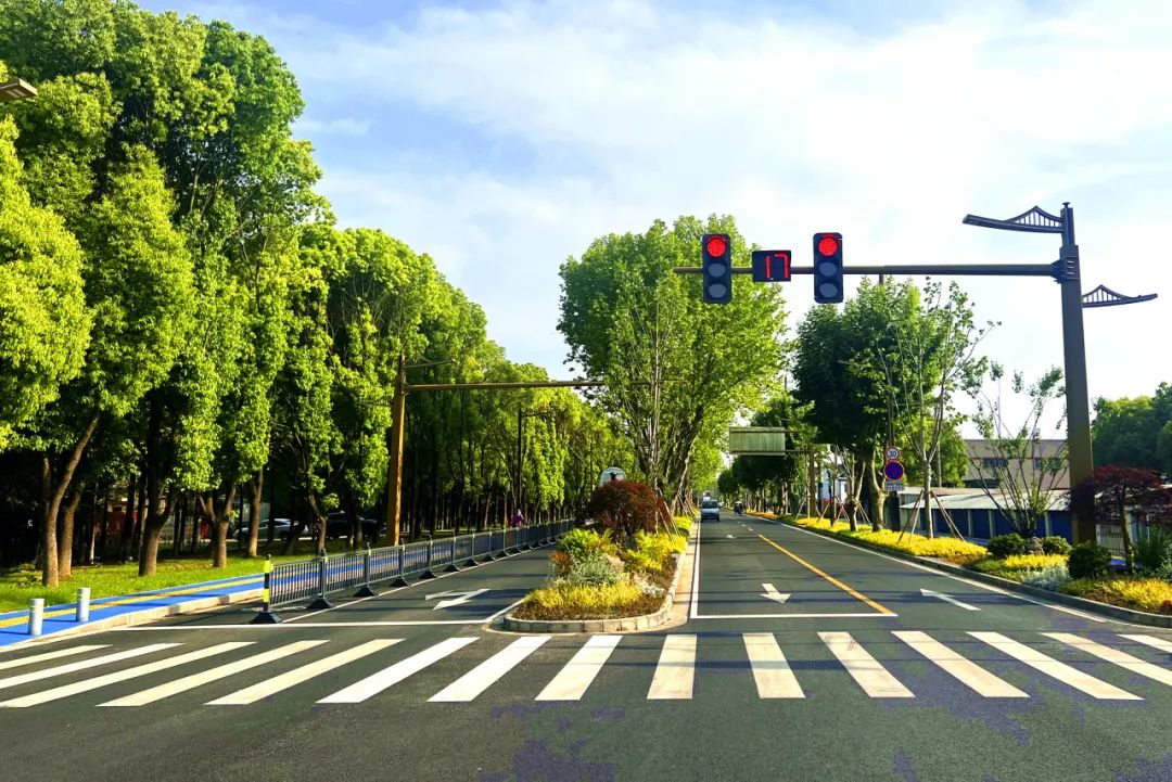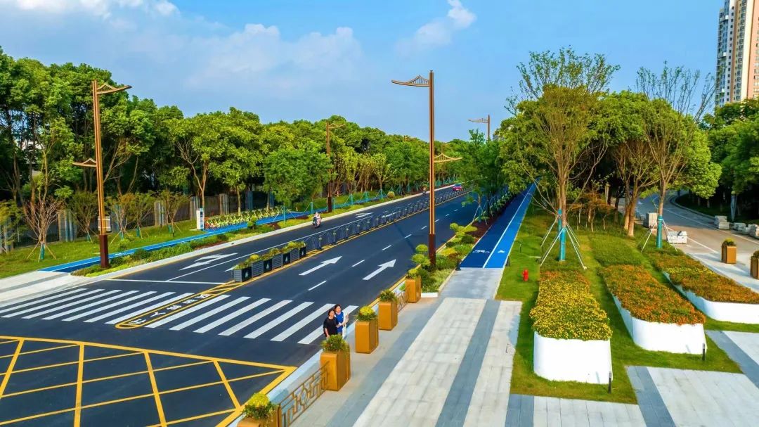 道路采用双向两车道三幅路断面布置,两侧增设独立非机动车道及人行道,同时增加渠化机动车行车道,全线新建雨、污水管道,并通过丰富景观植物与功能空间相结合,打造特色节点,给人一种“转角遇见美好”的舒适体验感,其中,改造绿化约3500平方米,建设休闲步道约2.5公里。