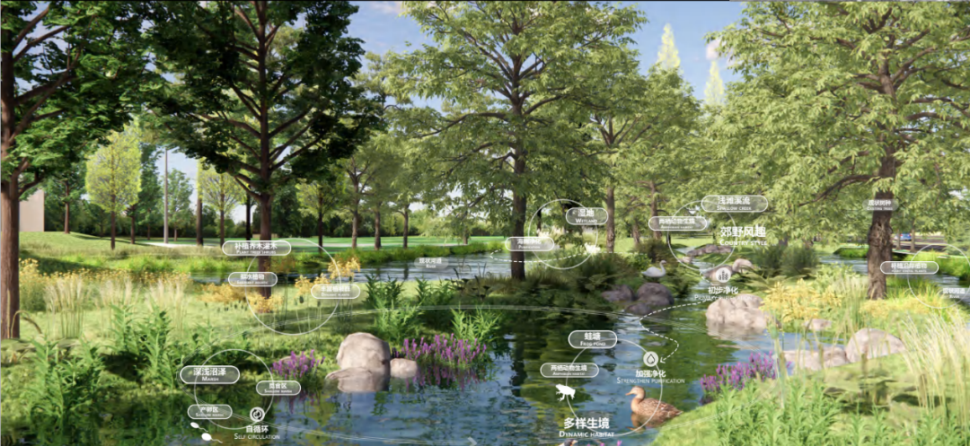 设计中配合空间类型,大量增加植物种类与层次,设计植物群落而不是单个植物。这样不仅大大增加了植物的观赏性和丰富性,更重要的是造就了韧性的生态功能、多样化的生境。湿地、树林、湖泊等多样生境为鸟类和哺乳动物的栖息地提供了一个灵活的开放空间。