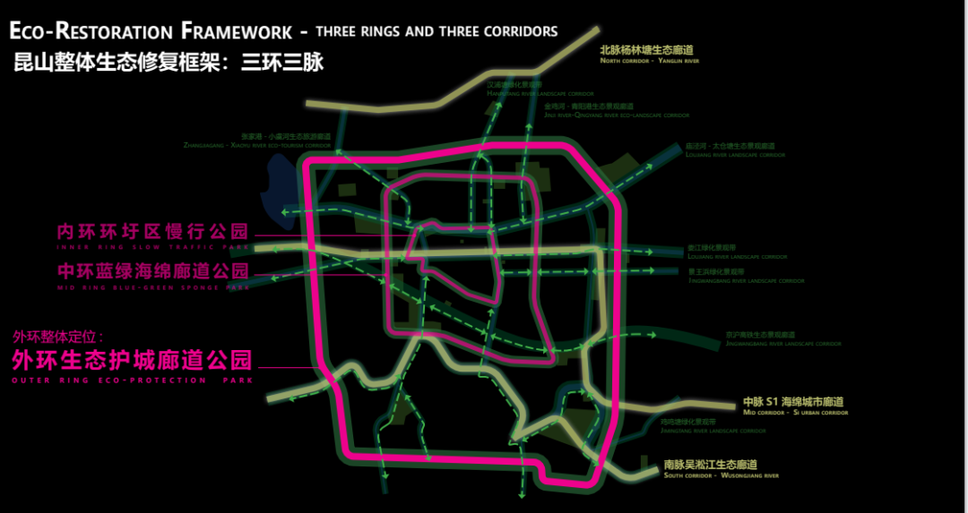 以此为契机,重新梳理了昆山核心城区,整合绿地空间资源与运河水系统,强化核心城区及城市绿色廊道系统,健全城市开放空间系统和城市脉络。这是昆山首次引入水系统管理,生态系统等绿色基础设施的建设项目,我们建立了中环蓝绿海绵廊道公园,为昆山城市更新和城市再生拉开了序幕。也是第一代绿色低碳、海绵城市技术的试验和实践。