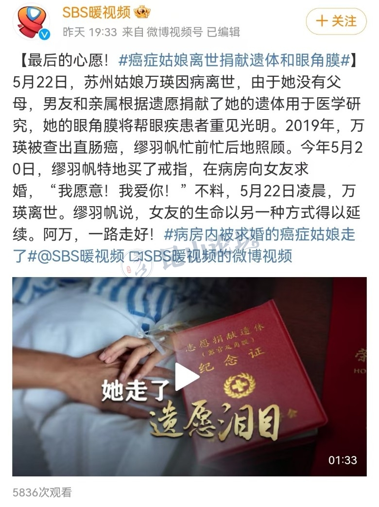 看到这条新闻还是蛮感动的,爱和生命可以以另一种方式延续下去。