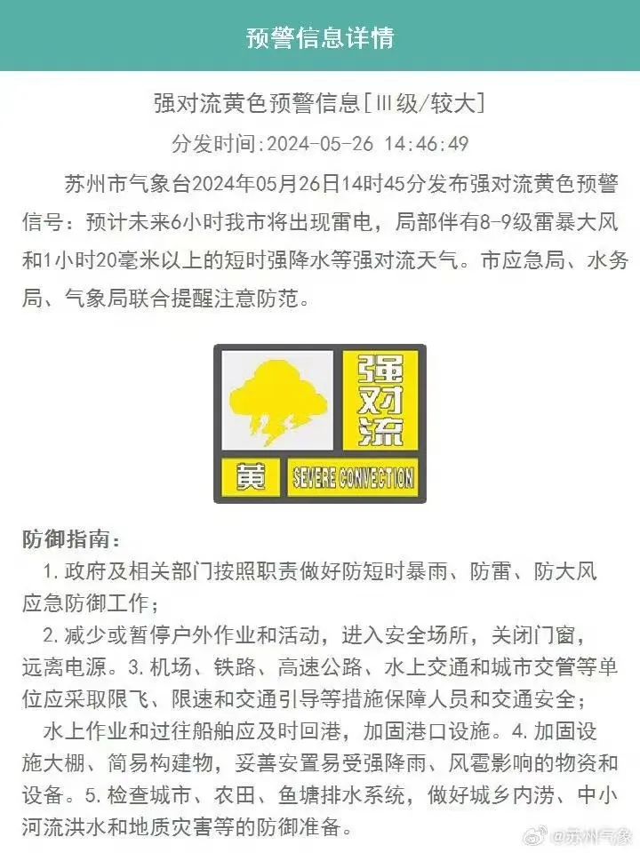 预计未来6小时苏州市将出现雷电,局部伴有8-9级雷暴大风和1小时20毫米以上的短时强降水等强对流天气。市应急局、水务局、气象局联合提醒注意防范。