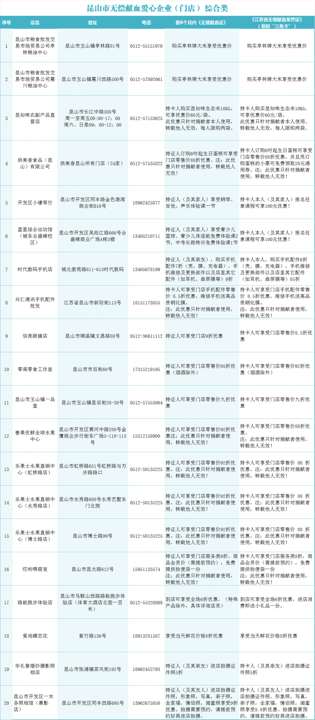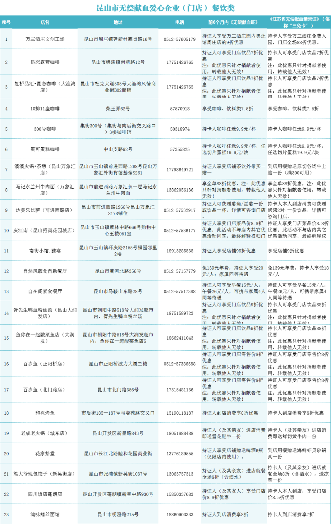 昆山市无偿献血爱心企业(门店)打折、优惠券等福利内容如下: