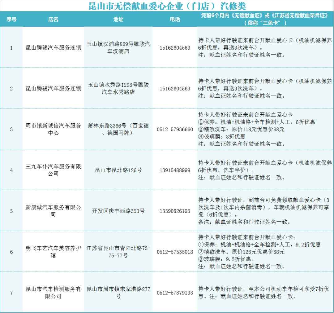 备注:昆山市无偿献血爱心企业(门店)正在不断扩充中,更多优惠福利敬请期待。