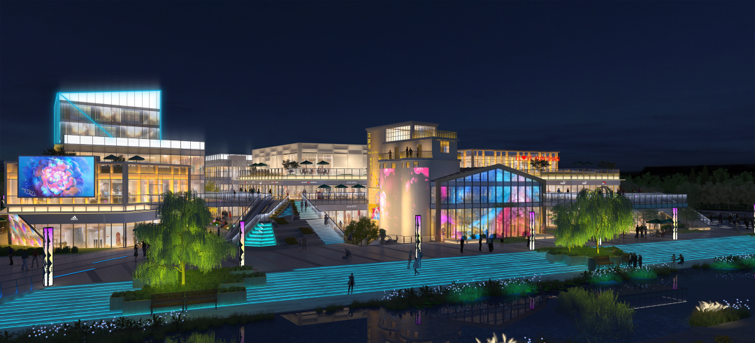 项目两面临河、两侧环路、毗邻居住集中区,设计时采用开放式庭院街区布局,涵盖滨水景观、庭院内街、船头公园、阳光音乐草坪、商业集市外摆等主题空间,缔造新的沉浸式体验打卡路线。
