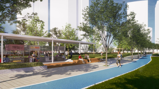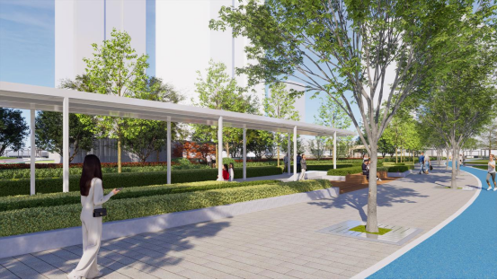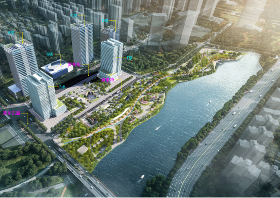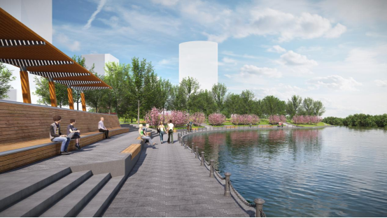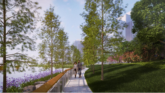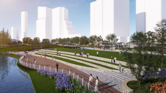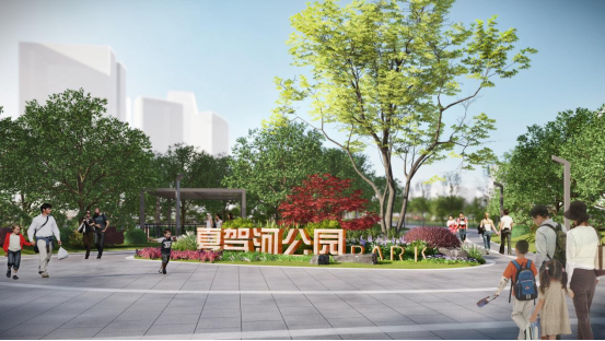 夏驾河公园站景观工程项目以“开放-植入-串联-点睛”为设计策略,以“活力会客厅”和“生态滨水带”为整体景观定位,重点开放全线滨水界面,并通过绿道和滨水步道系统串联片区内外交通,沿线点缀多个特色节点,服务于周边金融商务和办公人群的日常休憩社交以及辖区居民群众的运动健身、休闲亲子等多样性活动,打造东部新城具有示范意义的城市滨水开放空间,最大限度发挥其绿地生态休闲功能和生态人文价值。此外,项目还延续了规划生态保护与资源利用相统一原则,为沿河道周边区域动植物提供最大生存空间,营造适宜生物多样性发展的生态栖息地。