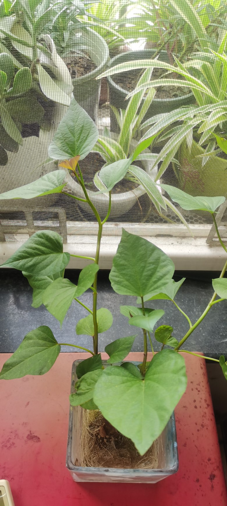 买的红薯发芽了,就放画画涮笔的小盒子里养着了,