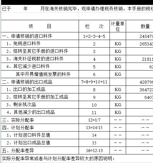 进料加工手册全部完成后,先到海关核销,再按规定时间,准备好所需要资料,到国税局进行手册核销,得出已核销手(账)册的综合实际分配率。