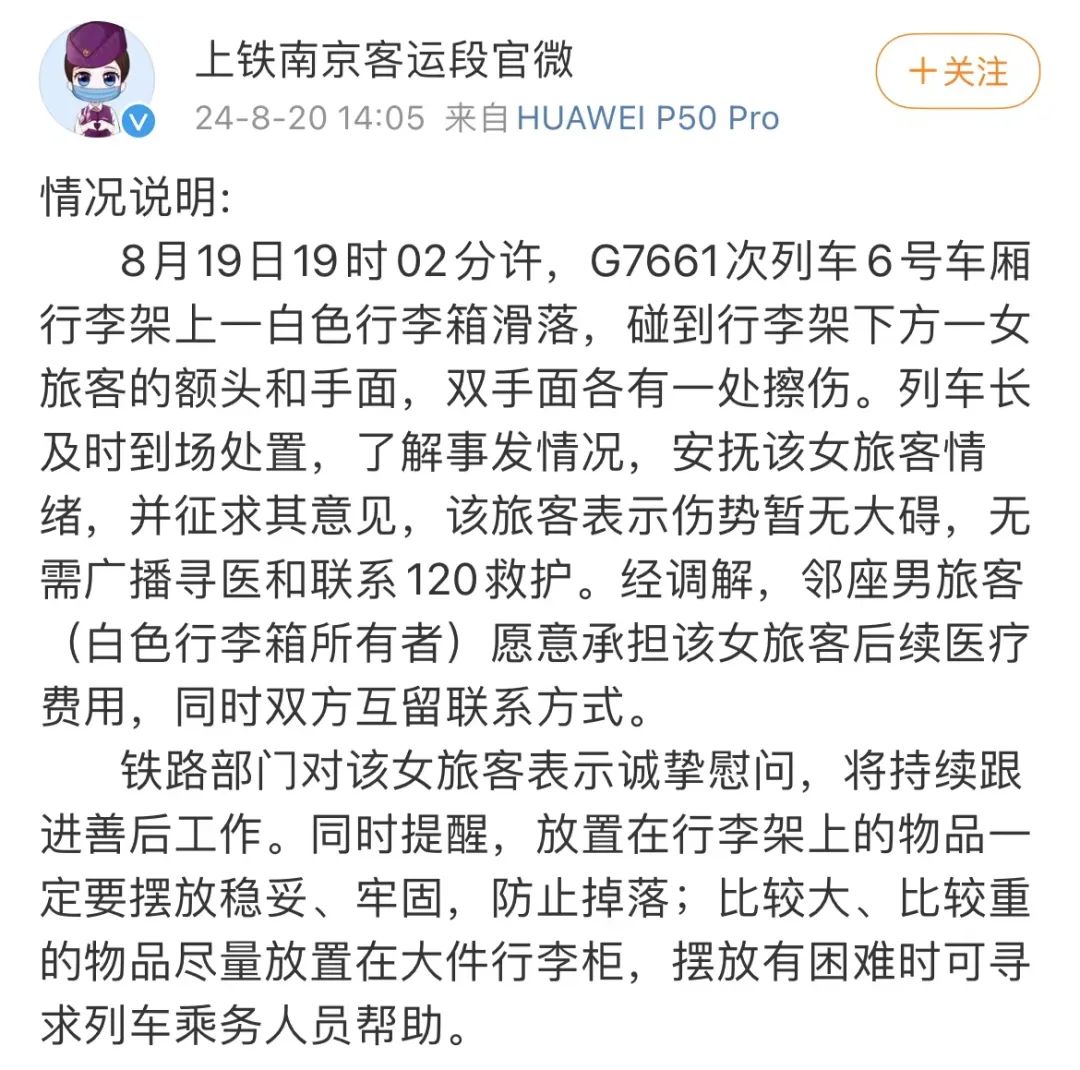 8月20日,@上铁南京客运段官微 就此事发布情况说明,称该旅客表示伤势无大碍,行李箱所有者愿意承担其后续医疗费用。