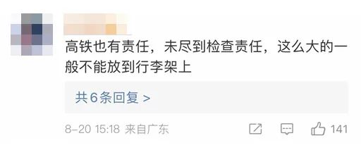 8月19日,有网友发视频称,G7661次列车刚开出几分钟,因转弯颠簸,行李架上的行李箱没放好滑落下来,一女乘客头部与手部被砸,情绪崩溃大哭。
