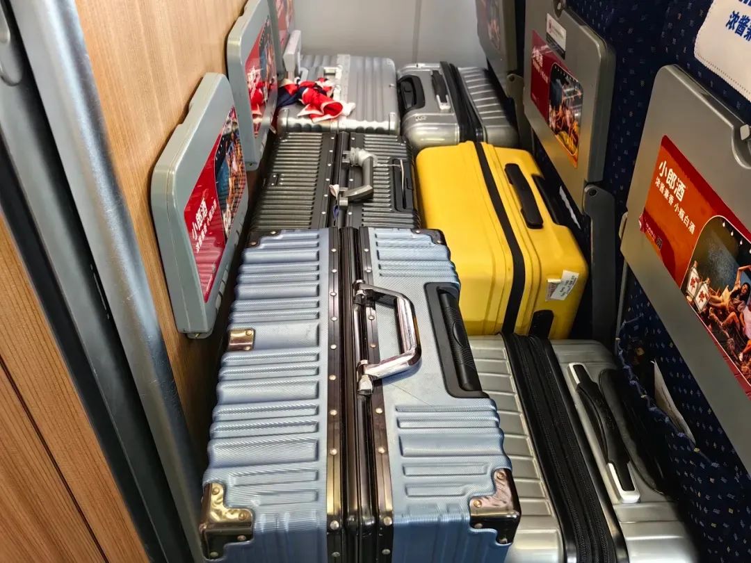 ✍大件行李放在大件行李存放处,不占用席位、不堵塞通道;如果大件行李存放处已放满,可将行李放置在车厢末端座椅靠背后面的空隙处。