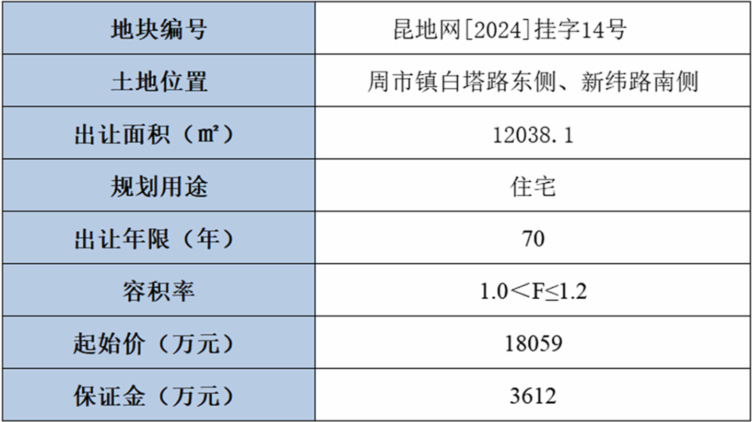 9月27日,昆山市自然资源和规划局发布昆地网[2024]挂字14号公告,挂出1宗位于周市镇的住宅用地。该地块位于周市镇白塔路东侧、新纬路南侧,出让面积12038.1㎡(约18.05亩)。地块公告期至2024年10月19日,正式报名时间为2024年10月20日9:00起至2024年10月28日下午16:00,并于2024年10月30日上午11:00准时进入限时竞价。