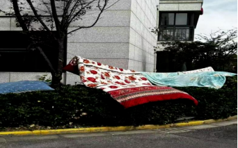 存在问题:被子床单就挂在小区绿化带上晾晒,广场公共区域晒床垫
