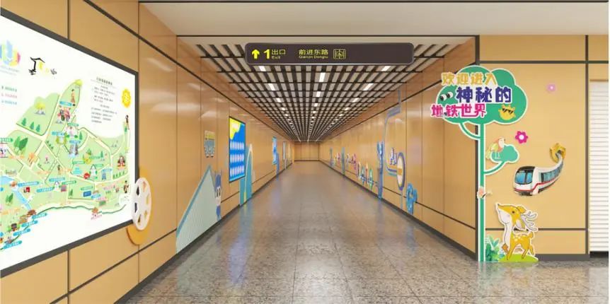 一米高度设置的趣味造型图,让小朋友自行探秘地铁世界,了解交通工具的变迁及科技创新给我们生活带来的奇妙变化。彩虹楼梯、儿童笑脸树、卡通身高尺吸引着小朋友驻足停留,增强小朋友们的出行体验。五彩斑斓的灯箱里展示着儿童友好欢乐地图、奇妙的地铁等内容,呼应车站主题,也为后续开展地铁实践等儿童友好活动,提供一处全新阵地。