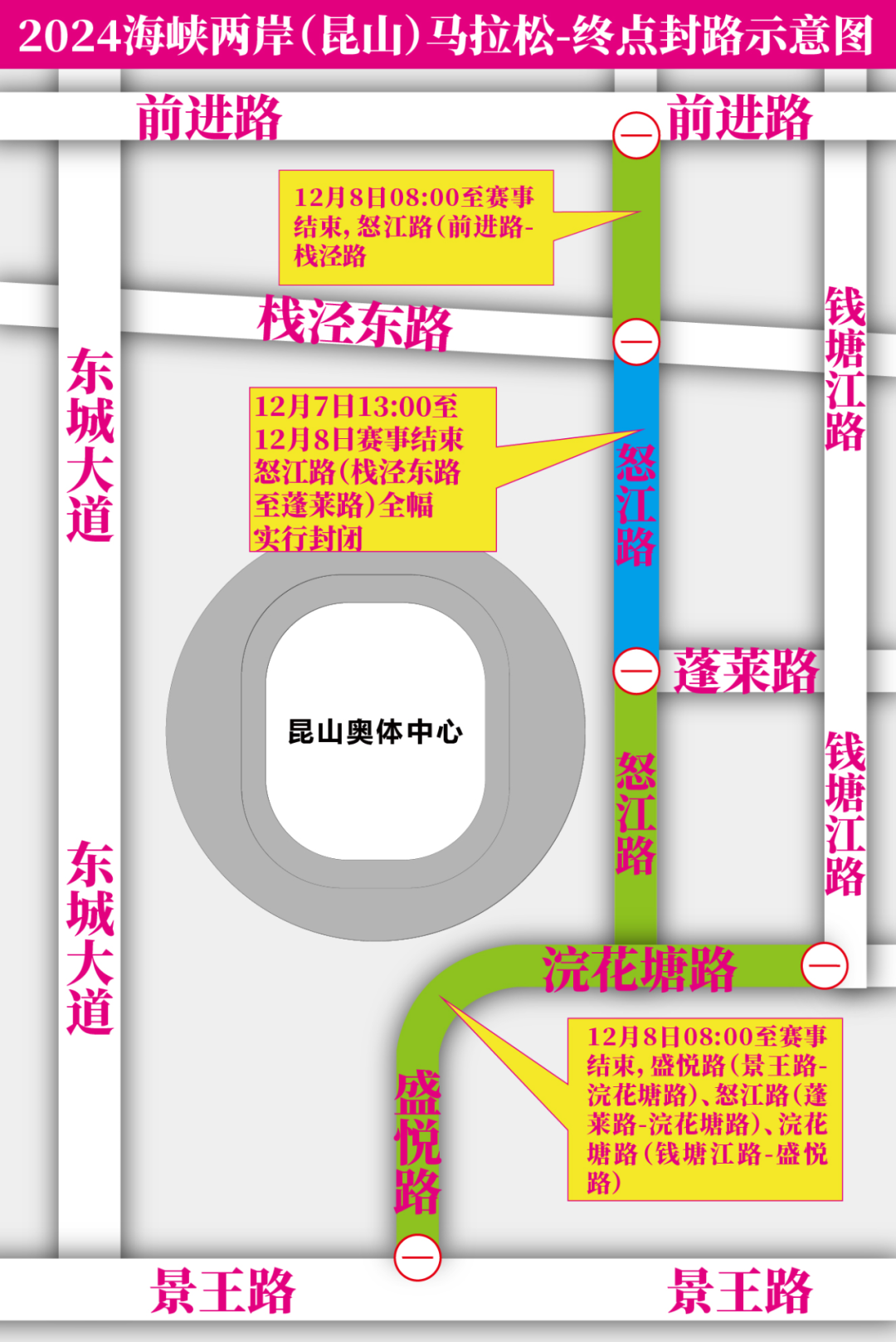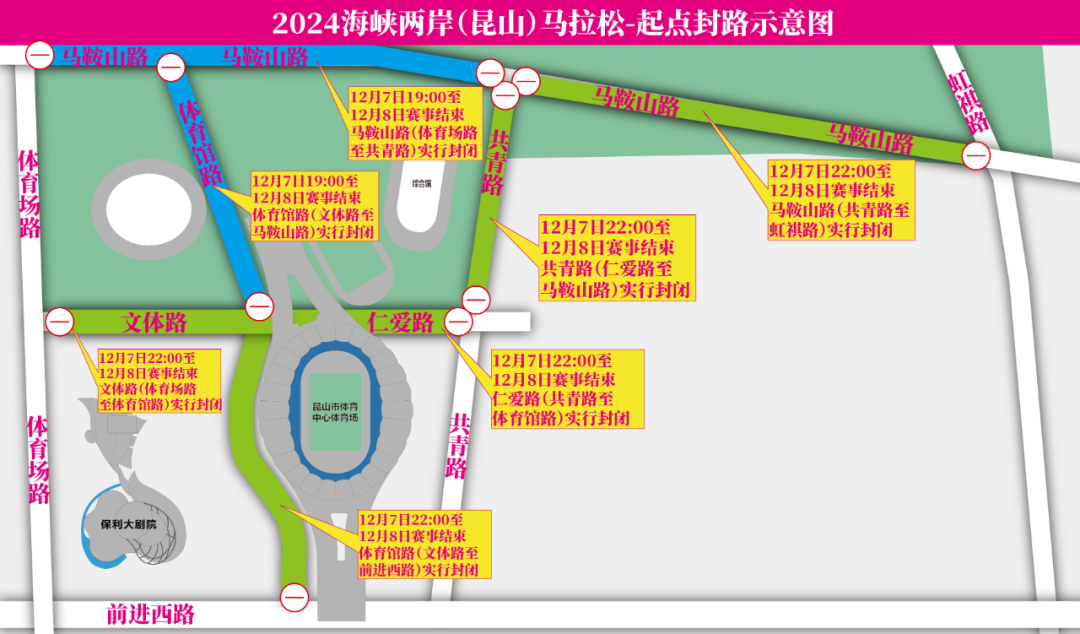 2024海峡两岸(昆山)马拉松将于2024年12月8日(周日)8时在我市举行。为确保赛事的顺利进行和道路交通安全、有序,根据《中华人民共和国道路交通安全法》第39条规定,公安交通管理部门将在赛事期间对部分道路分时、分段采取临时交通管控措施。